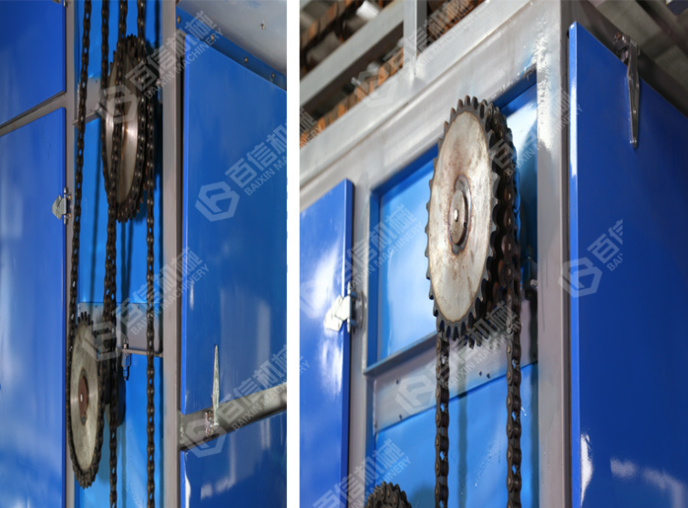 蓮子從上層進入,蓮子鋪料厚度由自動鋪料器控制,在網帶的帶動下,蓮子從上層往下層移動。運行中,蓮子有多次往下落的過程,使蓮子翻動、干燥更均勻。干燥好的蓮子從底層的出料口排出,在此過程中充分和高溫熱空氣充分接觸,達到干燥的效果。